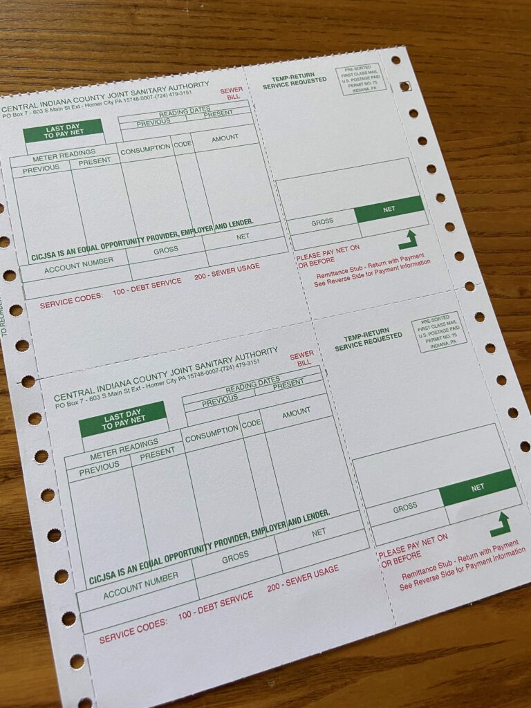 BILLING SNAFU!!! We are looking a little “green” today, but not our bills! It appears that the recent November 28th bills were printed on PLAIN WHITE CARDS instead of our usual preprinted cards (like the ones pictured). These plain white bills are legitimate but we are working with our third party vendor to have a reprint on the correct card stock. We have alerted S & T Bank-Homer City to the bill snafu. You can use the plain white bills at Homer City S & T and the CICJSA Office to pay your bills. If you use our website, that information is printed on the bill – www.cicjsa.org – and you can still access that to pay your bill. We apologize for the confusion and inconvenience. If you have any questions, please feel free to call our office at 724-479-3151.